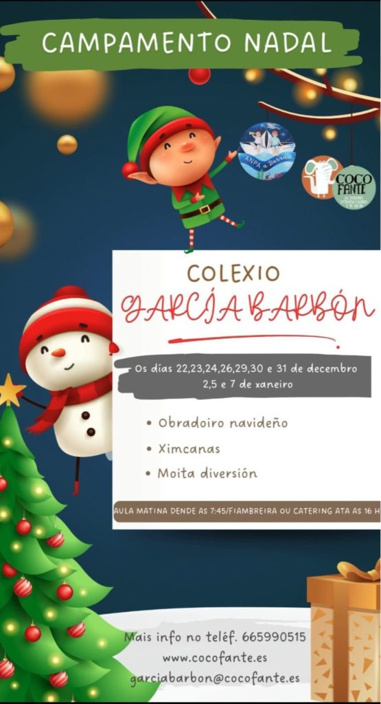 Informámosvos de que xa están abertas as inscricións para o Campamento de Nadal no CEIP García Barbón, organizado por Cocofante en colaboración coa ANPA A Barxa.